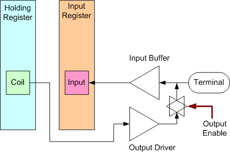 Terminal signal direction (input or output) is determined by last operation on corresponding MODBUS object.
